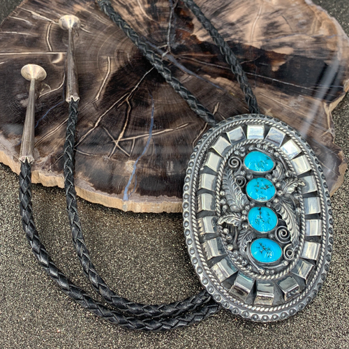 Vintage Native American Navajo Sterling Turquoise Large Fancy Bolo Signed TB