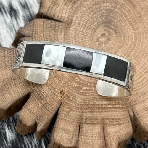 1980s Native American NAVAJO Sterling Onyx Mother Of Pearl Inlay Cuff Bracelet