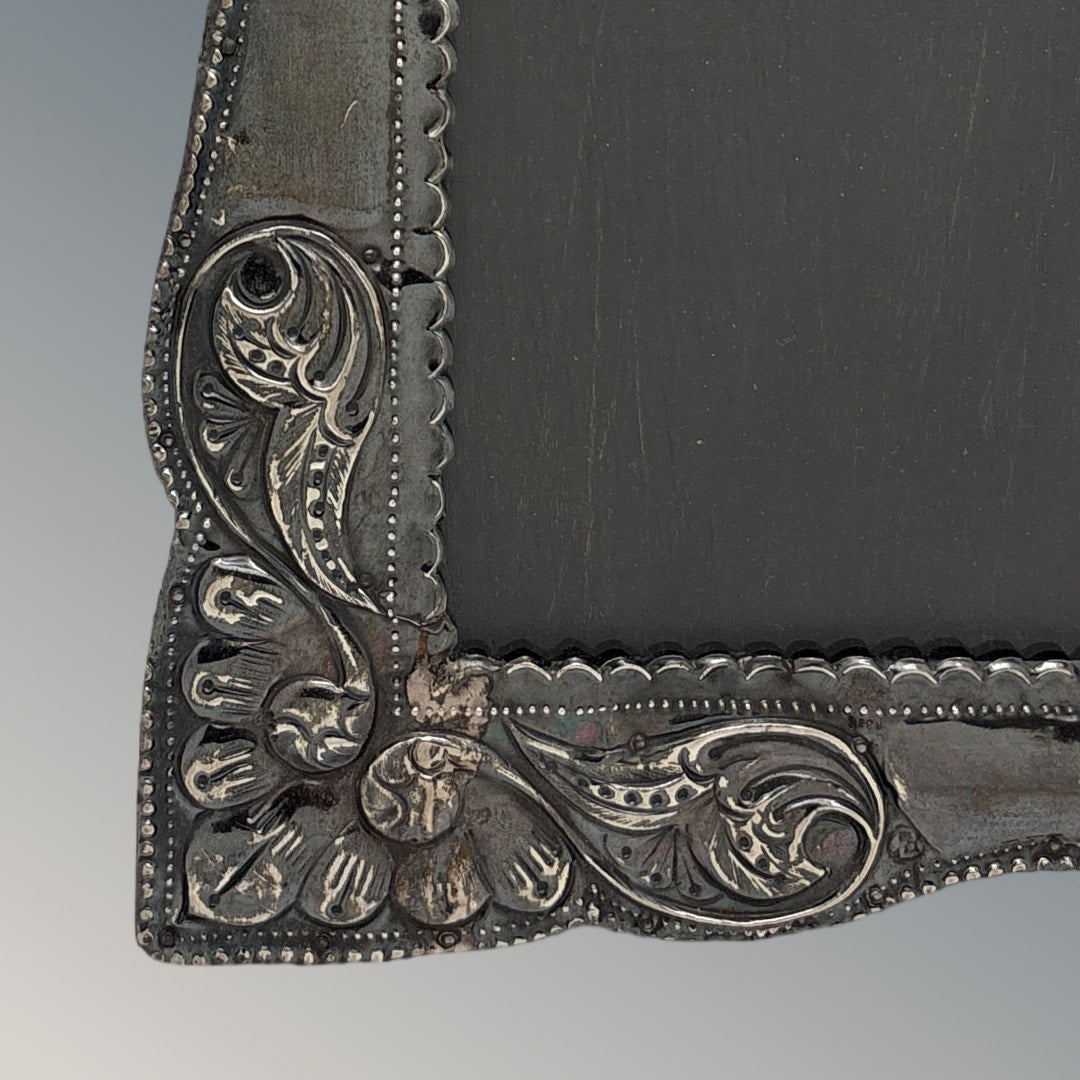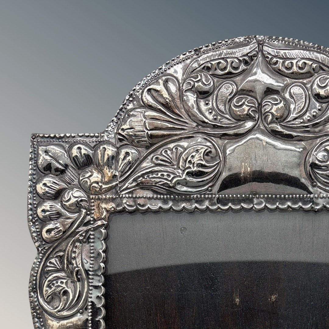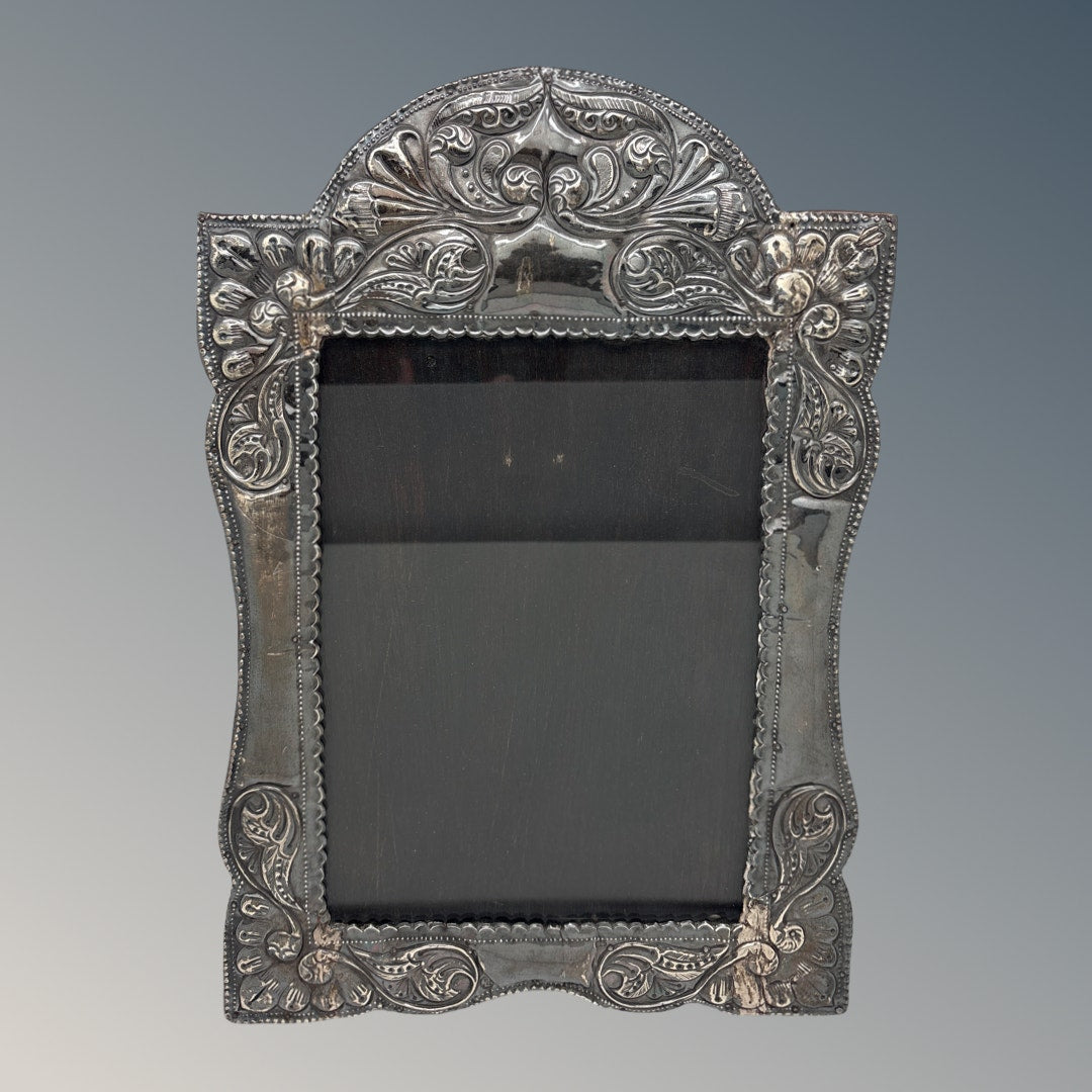 This fabulous antique sterling silver picture frame with glass insert features a charming wood easel backing with a hinged door, overlaid with a beautifully hammered sheet of sterling silver secured by tiny nails. The graceful curves of the frame, delicate floral accents, and scalloped inner edges give it wonderful character and visual interest, striking a perfect balance between elegance and ornamentation. A small metal clasp on the left side of the door holds the backing securely in place. The picture frame has not been polished, retaining its patina. There are no visible hallmarks, which is not uncommon for antique silver frames of this era. With its substantial size and timeless design, this piece is a striking decorative accent that adds warmth and sophistication to any space.