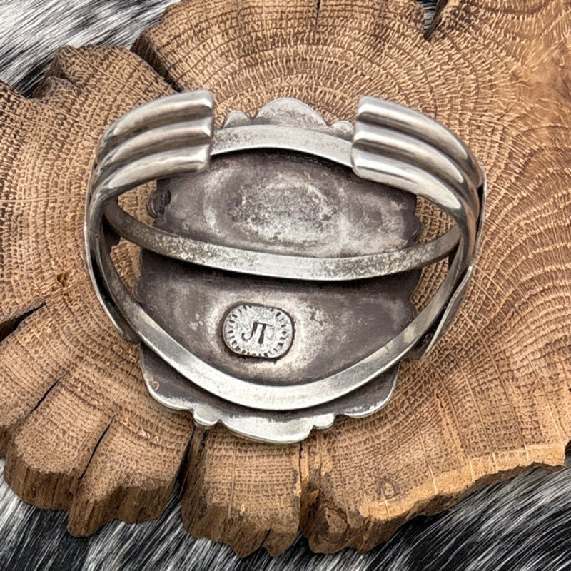 This gorgeous vintage Navajo-made sterling silver statement cuff bracelet features an eye-catching cluster design composed of individually set brilliant blue turquoise stones, each secured in fine tooth edge bezels. The center pair of stones is further highlighted with elegant twist wire borders, while two sizes of silver raindrops adorn both the inner and outer edges for added depth and dimension. Hand-stamped repousse floral designs frame each side of the cluster, enhancing its artistry. The band is constructed from three tightly placed rows that create a sturdy and beautifully balanced structure. The lower back is hallmarked with a plaque bearing a conjoined JT surrounded by tiny vertical line stampings, adding a special touch of authenticity. Measuring 6.125 inches in total inside circumference and weighing 73 grams, this bracelet is a striking and collectible piece of Navajo craftsmanship.