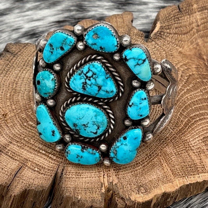 #VintageNavajo #TurquoiseCuff #StatementCuff #NavajoJewelry #SterlingSilver #ClusterDesign #BlueTurquoise #NativeArtistry #RepousseDesign #HandmadeSilver #TurquoiseCluster #SouthwestStyle #OldPawnStyle #ArtisanJewelry #NavajoDesign #VintageFinds #JewelryCollector #SilverCuff #TurquoiseLove #CestLaBries