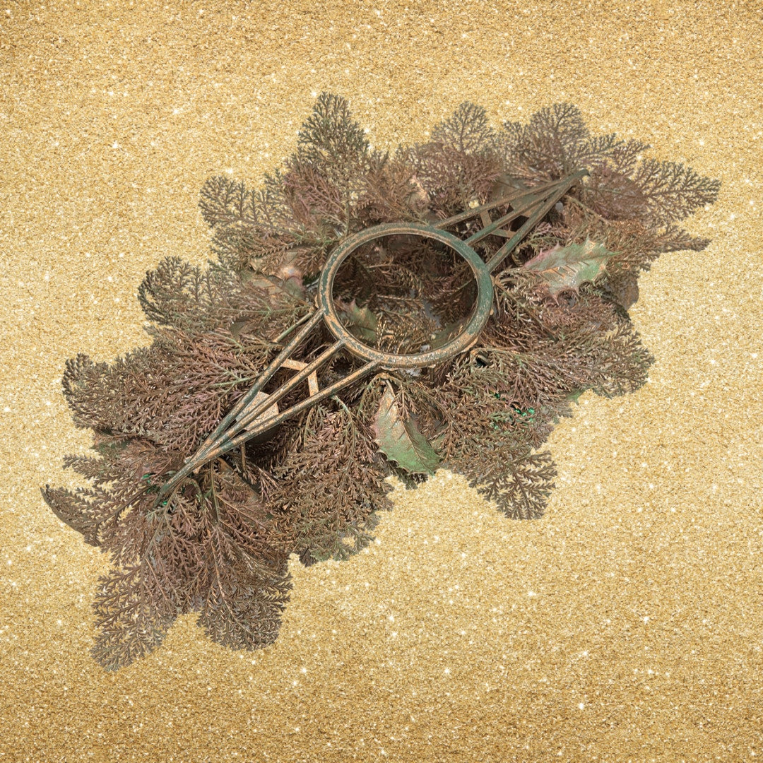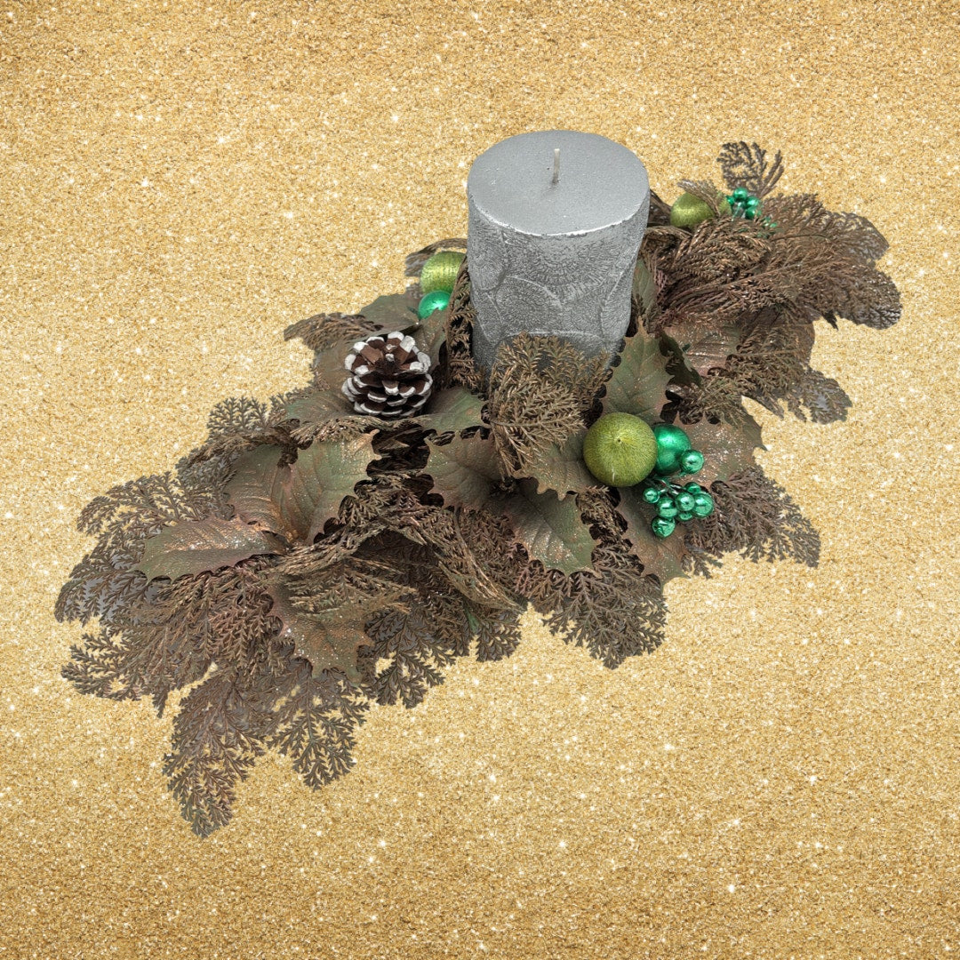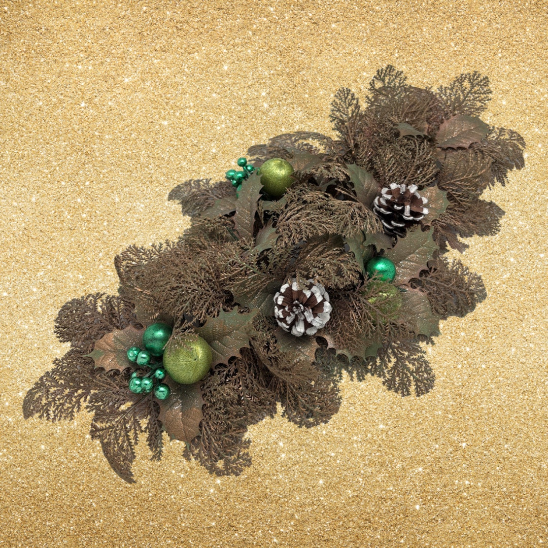 This beautiful vintage holiday pillar candle display features an elegant and softly glamorous design that captures the festive style of the 1960s. Gold painted faux holly leaves are paired with delicate branching elements, metallic green berries, lighter green metallic thread ornaments, and natural pinecones for a richly layered look. Designed to hold a pillar candle at its center, this elongated arrangement works wonderfully as a table centerpiece, mantel accent, or sideboard decoration. The center opening accommodates a pillar candle up to 3.25 inches in diameter. Measuring 20.5 inches long and 12 inches wide, this display adds timeless holiday warmth and vintage charm to any seasonal setting.