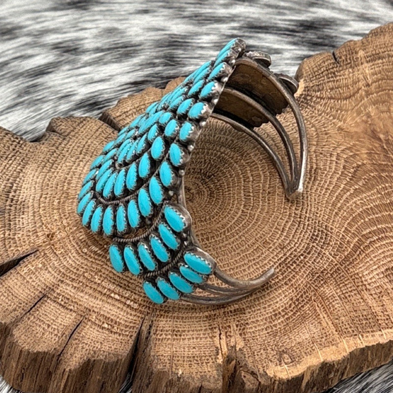 This beautiful vintage sterling silver Zuni-made cuff bracelet showcases a classic oval cluster design featuring teardrop-shaped stones, each individually bezel set with careful craftsmanship. Fine twist wire rows separate each cluster layer, while delicate raindrops accent the outer edge for added texture and depth. Two matching curved rows frame each side of the central cluster, enhancing its symmetry and visual appeal. The band is formed from three sturdy rows, creating a balanced and comfortable fit. After examining the stones, they appear to be possibly block turquoise due to their uniform color, though the overall construction is great. The center back is hallmarked with a conjoined BB and STERLING. With a total inside circumference of 6.125 inches and a weight of 46 grams, this bracelet is a charming example of vintage Zuni artistry.