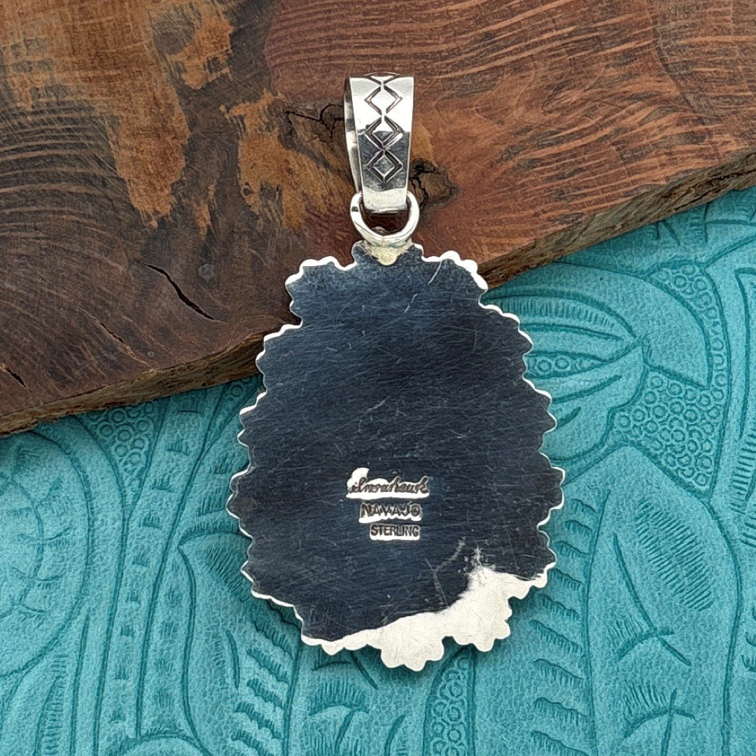 This gorgeous pendant by the award-winning Navajo artist Allison Snowhawk Lee features a dreamy turquoise cabochon from the legendary Number 8 Mine. The stone is secured in his signature picket fence bezel, creating bold dimension and architectural presence. Surrounding the stone is a dramatic row of large-scale star shots, giving the pendant a standout look. The generously sized bail is adorned with a double row of V-shaped decorative stampings and comfortably accommodates beads up to 10mm, making it versatile for pairing with a variety of necklaces. The back is stamped Snowhawk NAVAJO STERLING, confirming authenticity. Measuring just over 2.625 inches including the bail and weighing 36 grams, this pendant is a stunning and collectible work of contemporary Navajo art.