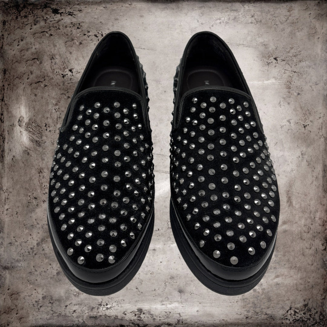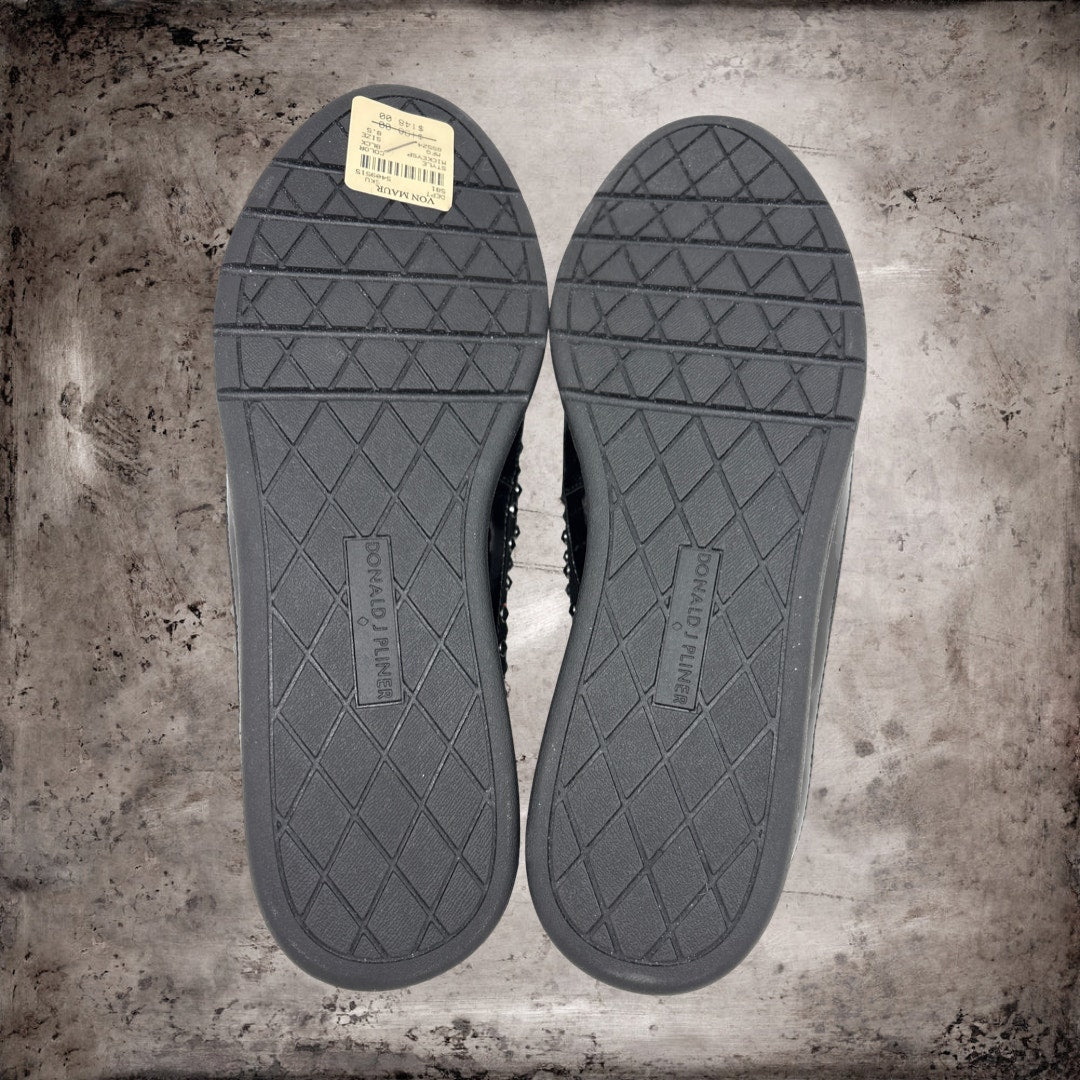 This beautiful pair of Mickey platform loafers by Donald J Pliner combines classic sophistication with modern edge. Designed in a rich black color, the loafers feature supple black suede uppers accented with black leather trim and a sleek band of black patent leather where the upper meets the rubber sole. Gunmetal color studs blanket the design, adding texture and contemporary flair. I am the original owner of these loafers and they have never been worn. Purchased at Von Maur department store for $148.00, they originally retailed for $198.00, making this a fantastic opportunity to own a statement shoe from a highly respected designer.