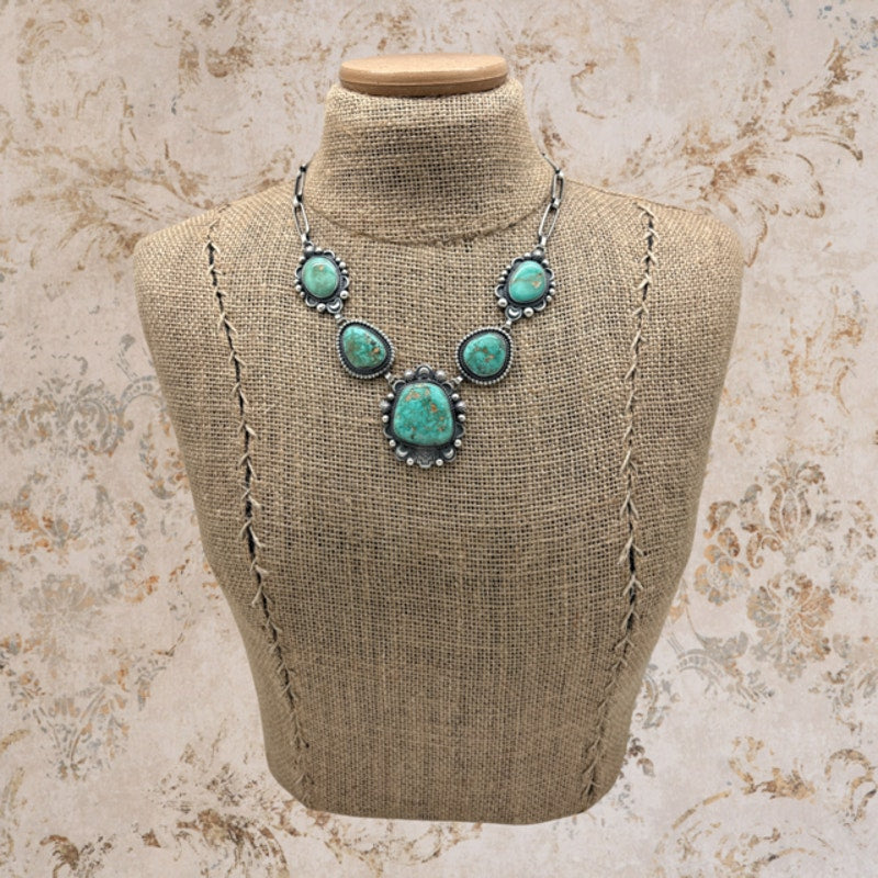 This gorgeous turquoise statement necklace by Navajo artist Mary Ellen Pease, matriarch of the renowned Willie family, showcases her masterful silversmithing and refined design sensibility. The necklace features five dreamy Armenian turquoise stones, each individually bezel set and framed with a twist wire border. Three of the settings are richly embellished with repousse crescent details, stamped raindrops, and smooth raindrops, while the remaining two are accented with delicate borders of fine raindrops for balance and contrast. A bold large-scale paper clip chain and a hook and eye closure complete the piece, giving it a modern yet timeless presence. The center back of the centerpiece is stamped Mary Ellen in script along with STERLING, confirming authenticity. Measuring nearly 20 inches across the top and weighing 77 grams, this new and never worn necklace is an exceptional contemporary Navajo creation.