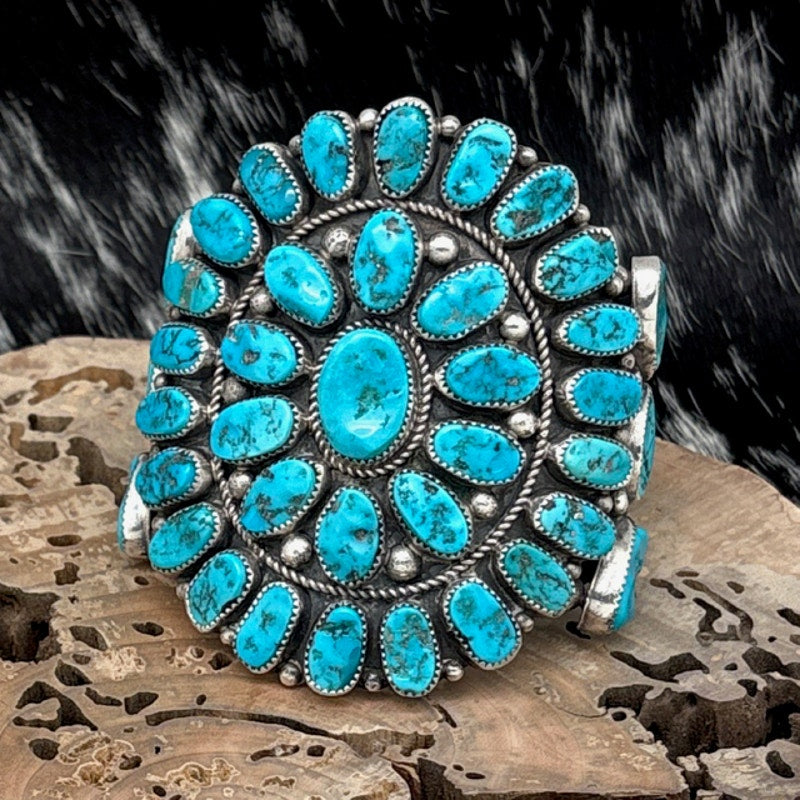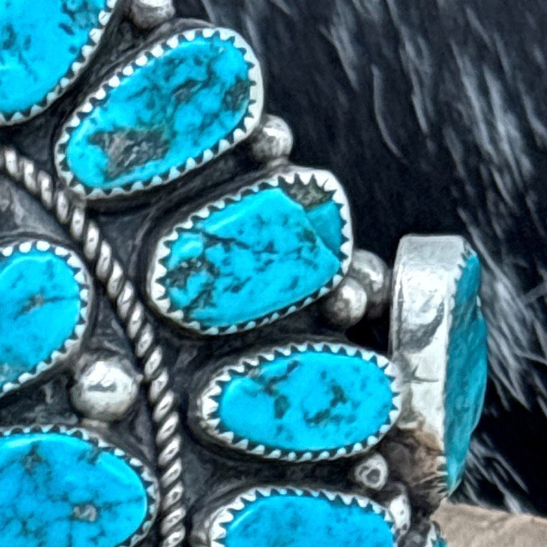 This fantastic vintage statement cuff bracelet by Navajo artist Richard Hoskie showcases bold scale and masterful silverwork through an impressive cluster design of vibrant Kingman turquoise cabochons. Each stone is individually bezel set with a fine tooth edge, while the outer row is separated by large raindrops and a continuous row of twist wire for dramatic definition. The inner stones are divided from the center stone by twist wire and accented with oversized raindrops, creating a beautifully stylized floral composition. Three additional stones curve gracefully along each side of the center design, adding balance and movement. The substantial band is formed from three solid rows that come together at each end. The bracelet is hallmarked R STERLING, and previous owners etched their names, Mary Nolan and A Nolan 12/97, into the back of the setting, adding a layer of personal history. With its commanding presence and weight of 174 grams, this cuff is a powerful example of 1980s Navajo artistry.
