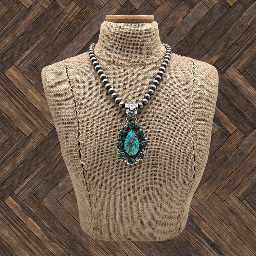 This wonderful sterling silver statement pendant by the talented Navajo artist Rosella Paxton beautifully blends bold form with intricate detailing. At the center is a striking teardrop-shaped Pilot Mountain turquoise stone, high bezel set and framed with a classic twist wire border that draws the eye inward. Surrounding the centerpiece are individually bezel set Hubei turquoise cabochons, each separated by graceful curly ques and alternating stamped and smooth flat raindrops, creating wonderful movement and texture throughout the design. The bail is richly decorated with stampings and accented with two distinct stamped raindrops, and it comfortably accommodates beads up to 16 millimeters in size. Stamped RP STERLING on the back, this pendant is a strong yet elegant contemporary example of Rosella Paxton’s silversmithing.