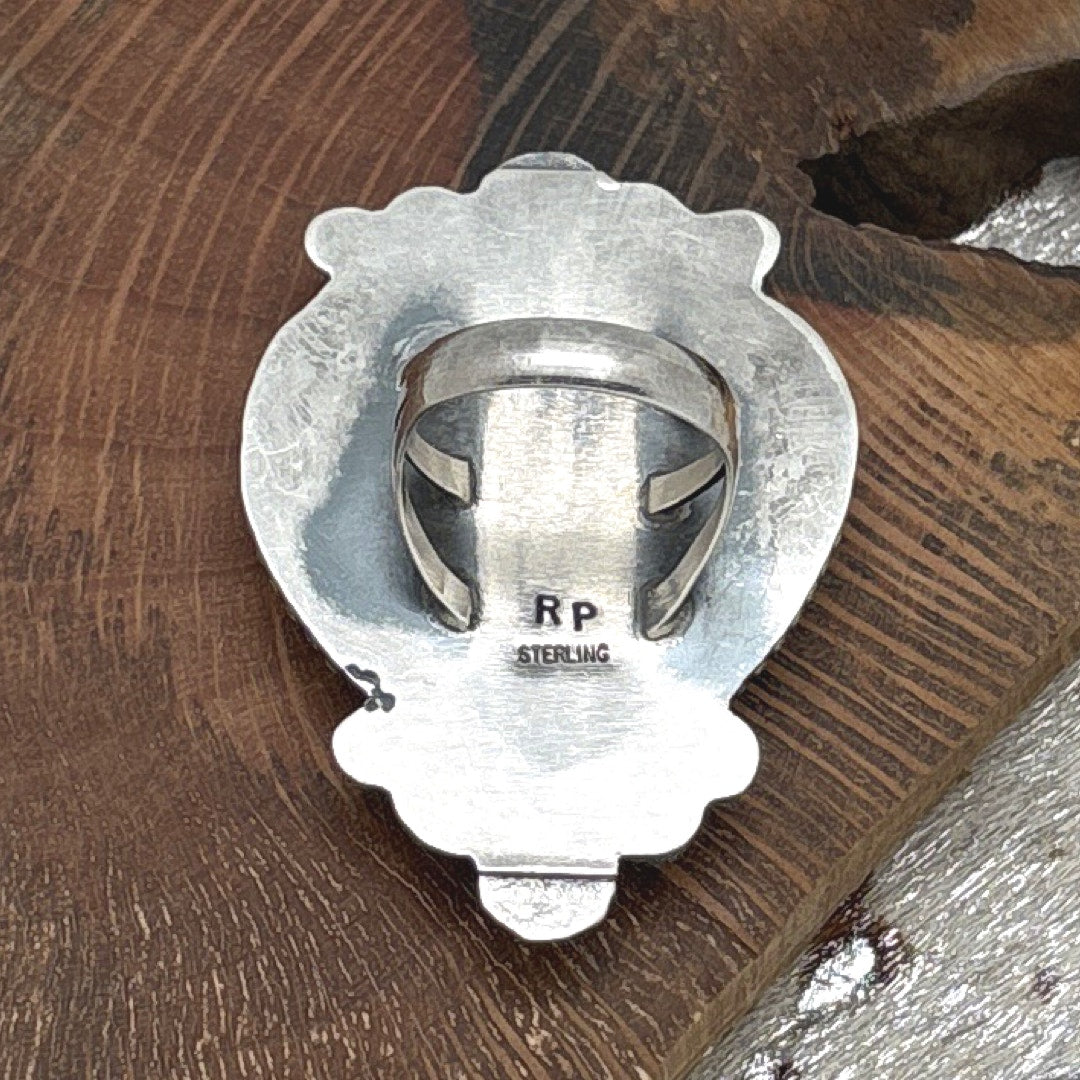 This beautiful sterling silver statement ring by the talented Navajo artist Rosella Paxton showcases a bold and romantic design centered around a striking heart-shaped lapis lazuli stone. The lapis displays a rich cobalt blue color accented with a natural yellow pyrite matrix, giving the stone wonderful depth and character. It is bezel set and framed with a dotted border that adds texture and definition. Graduated clusters of five starshots adorn both the top and bottom of the setting, creating balance and visual interest. A solid triple shank band completes the look, providing both presence and comfort. Stamped RP STERLING on the lower back of the setting, this ring is a standout example of contemporary Navajo silversmithing.