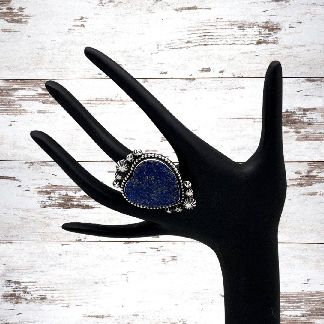 #RosellaPaxton #NavajoArtist #StatementRing #SterlingSilver #LapisLazuli #HeartRing #NativeArtistry #ContemporaryNavajo #WearableArt #SilverRing #BoldJewelry #GalleryJewelry #ModernSouthwest #CollectorPiece #ArtisanJewelry #StarshotDesign #UniqueRing #Size8Ring #ModernNative #CestLaBries