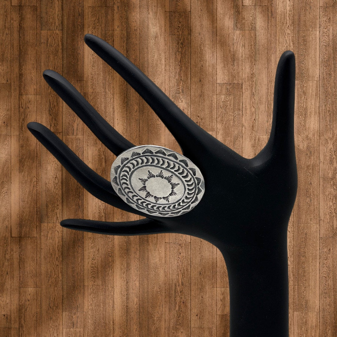 This beautiful sterling silver statement ring by the talented Navajo artist Rosella Paxton features a bold oval concho design rich with traditional detail and contemporary presence. The face is adorned with dramatic stampings, including dual border patterns and a radiant sunburst motif at the center that gives the ring strong visual impact. Crafted with confident scale and clean lines, this ring is both sculptural and highly wearable. The back of the setting is stamped RP on one side of the band and partially stamped STERLING on the other, confirming the maker and material. With a substantial face measuring over two inches in length, this ring is a striking example of modern Navajo silverwork.