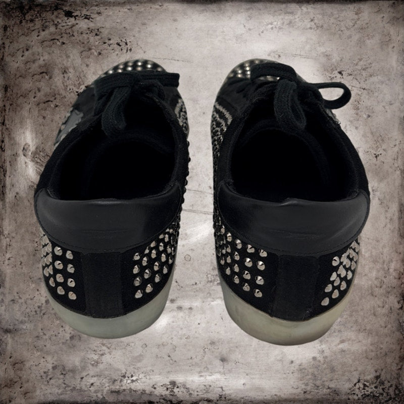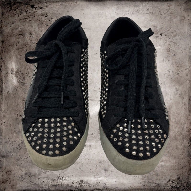 This stylish pair of Rockstar sneakers by Shu Shop offers an effortless blend of casual comfort and subtle glam. Designed in the Black colorway, the sneakers feature faux suede uppers paired with black shoelaces. Gun metal color studs all over the sneakers and faux leather star accents on each side add a playful yet polished touch. These sneakers come pre-distressed for a fashion-forward, lived-in look. I briefly wore the sneakers a couple of times but they are in great overall condition. I purchased the sneakers from Macoma Boutique and they shipped them to me without the original box, which is their standard policy.