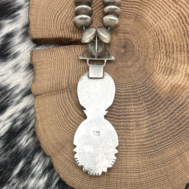 This stunning sterling silver statement necklace by the talented Navajo silversmith Wilson Padilla features a dramatic two-stone turquoise pendant showcasing an inverted teardrop stone above a classic cabochon. Each stone is beautifully bezel set within a decorative frame accented by precise saw cuts, while a pair of silver raindrops separates the two stones for added elegance. The striking stamped bale connects the pendant to a foxtail strand adorned with handmade graduating saucer beads ranging from 12mm to 14mm. A hook and double eye closure completes the refined design. The back of the pendant is stamped Wilson Padilla, confirming its authenticity. With a total length of 16.625 inches including beads and pendant and a substantial weight of 118 grams, this necklace is a bold and collectible example of Navajo artistry.